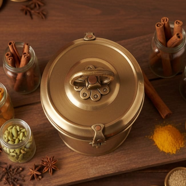 ORIGINAL ANTIQUE: AT/089 - Vintage Brass Cylindrical Lockable Box With Handle | KITCHENWARE | UTENSILS | HOME APPLIANCES
