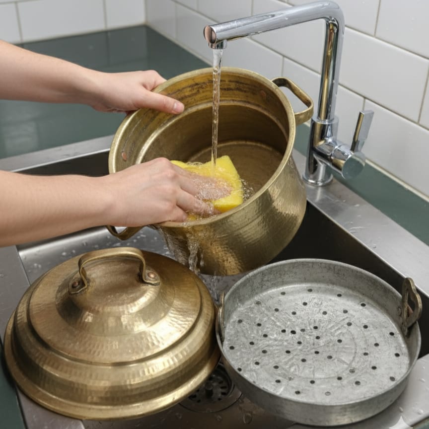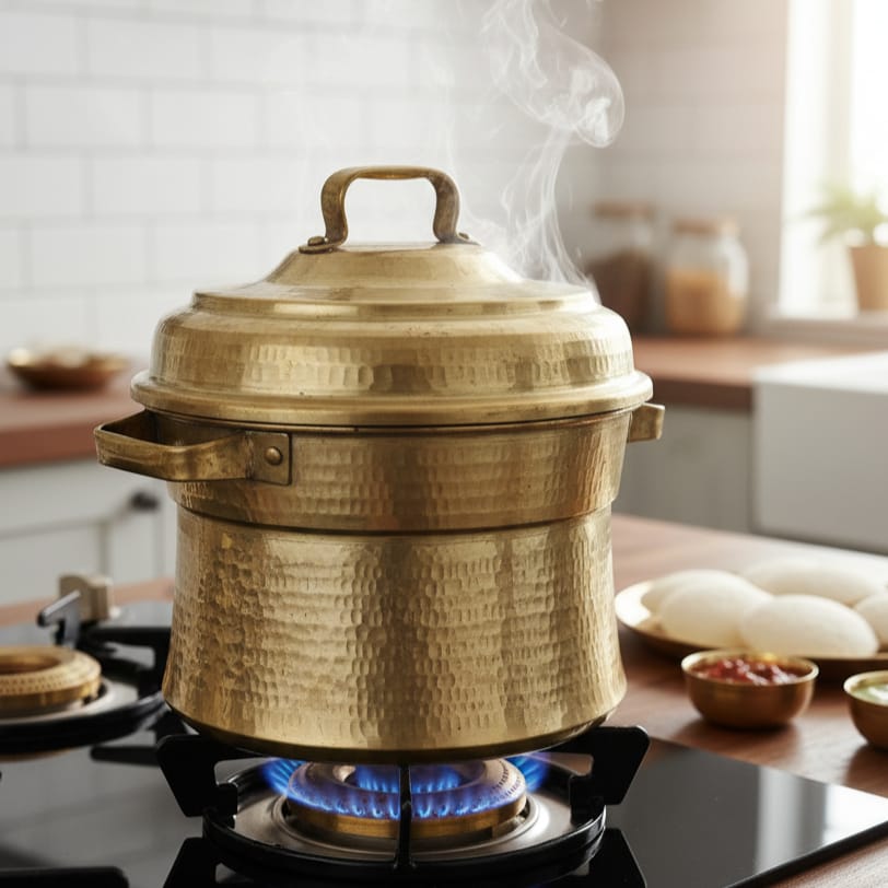 This exceptional vintage modak patra represents a masterpiece of traditional Indian metalwork. Handcrafted from pure brass and meticulously hammered into its distinctive shape, this authentic steamer vessel showcases the artisanal techniques passed down through generations. The intricate surface detailing and organic form reflect both functional design and aesthetic refinement. Originally used for preparing traditional modaks and steamed delicacies, this rare piece serves as a testament to pre-industrial kitchen craftsmanship. Its substantial brass construction ensures durability while the patina speaks to its genuine age and heritage. An invaluable addition for collectors of authentic Indian kitchenware and those seeking to preserve culinary traditions.