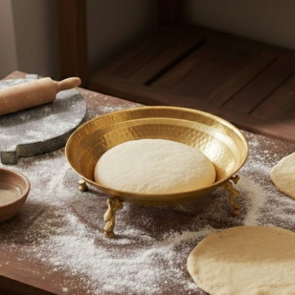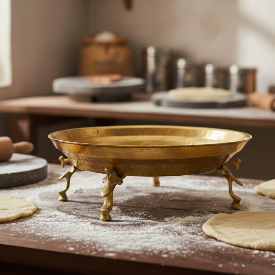 Crafted from pure brass, this antique parath tray sits atop intricately designed peacock legs. Perfect for kneading dough and showcasing your culinary skills, this unique piece adds a touch of elegance to any kitchen. A must-have for antique collectors and cooking enthusiasts alike.