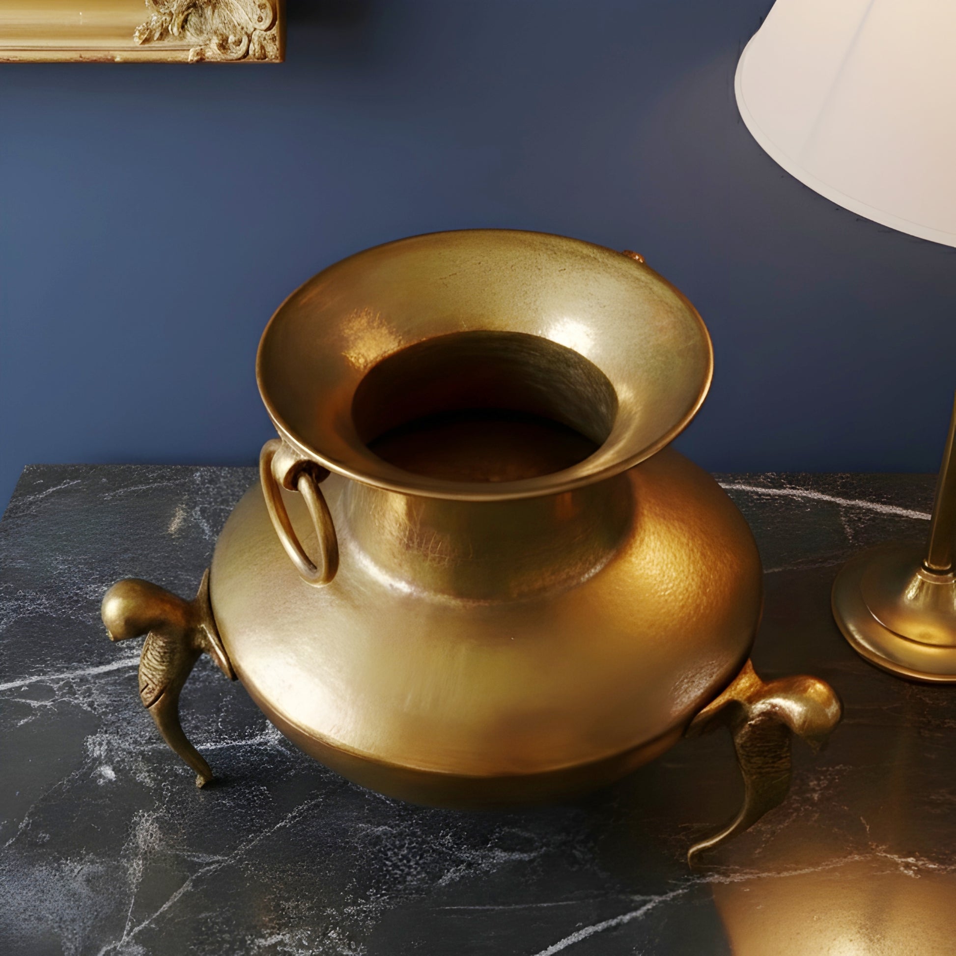 Crafted with pure brass, this vintage water pot boasts a rare and unique design with ornate parrot legs and handles. An original antique, it adds character and style to any space. The perfect blend of beauty and functionality.