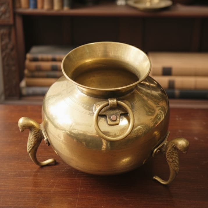 This exquisite vintage brass vessel showcases masterful craftsmanship with its perfectly symmetrical round form and distinctive parrot-leg base. Hand-forged from 100% pure brass, it displays the warm patina and weight characteristic of authentic antique metalwork. Originally designed as a multipurpose kitchen vessel, it functions beautifully as a decorative planter, vase, or display piece. The ornamental parrot feet add whimsical elegance while providing stable support. A remarkable example of traditional brass artistry, this piece brings timeless sophistication and functional beauty to any interior space.